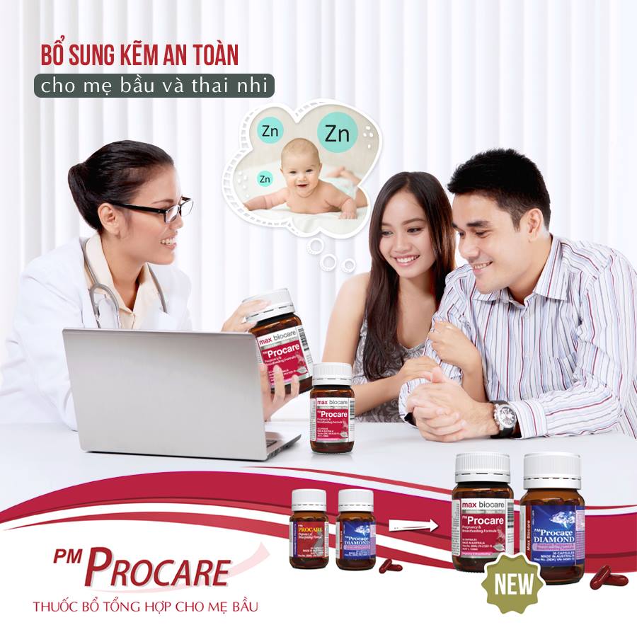 PM Procare hay PM Procare diamond cung cấp 8mg kẽm trong mỗi viên, đáp ứng khoảng 80% nhu cầu của cơ thể và nhiều dưỡng chất thiết yếu khác. Cùng với chế độ ăn, phụ nữ mang thai có thể tham khảo kết hợp 01 viên Procare mỗi ngày sau bữa ăn để hỗ trợ giúp cơ thể mạnh khỏe, thai nhi phát triển tối ưu.